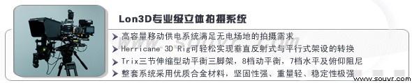 Lon3D立体拍摄系统是搜维尔公司、韩国Crazyk公司联合Miracube、Hurricane、DVInside、ATOMOS等共同研发,中韩多位知名3D专家参与论证,多家国际知名影视机构参与设计,其中 Hurricane 3D Rig荣获NAB2011黑钻石奖。整个系统采用人性化和模块化设计,充分考虑摄录编播线性关系,具有可操控性强、性能价格比高、灵活轻便、学习曲线短等特点,为目前国际市场上同类系统中的佼佼者,其绝佳性能深受3D专业人士亲睐,其优异表现颇受3D业界赞誉。